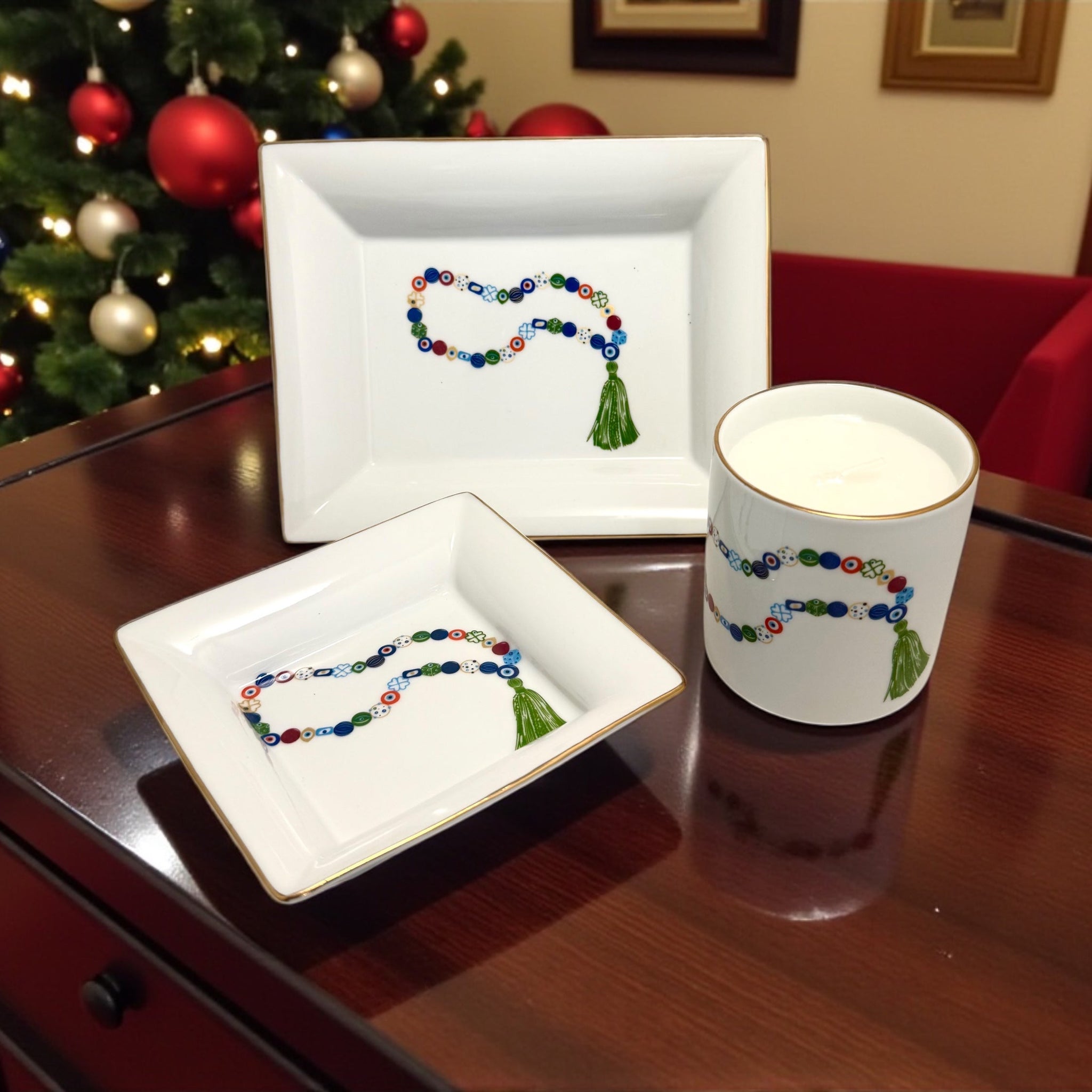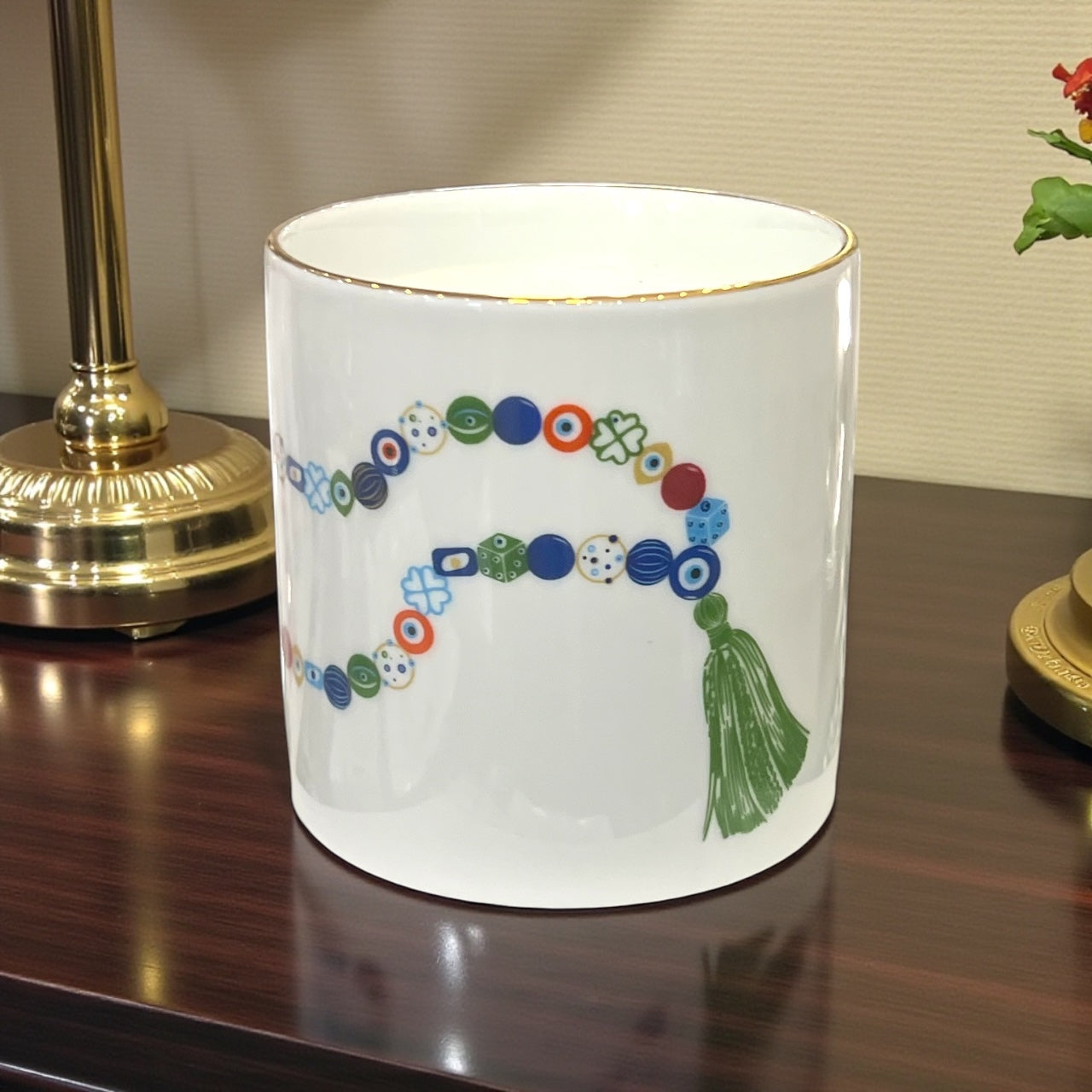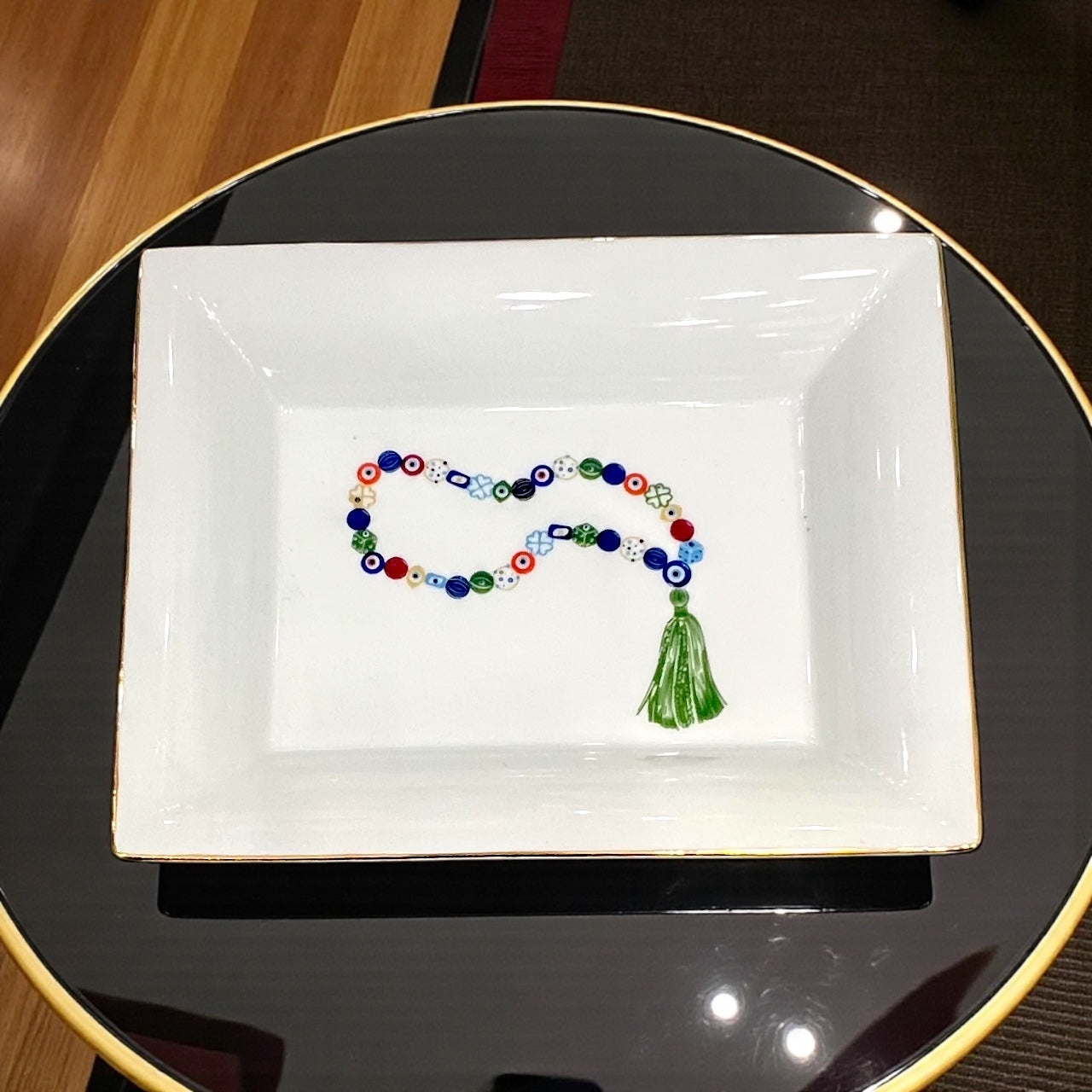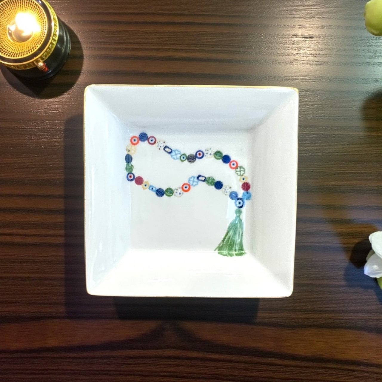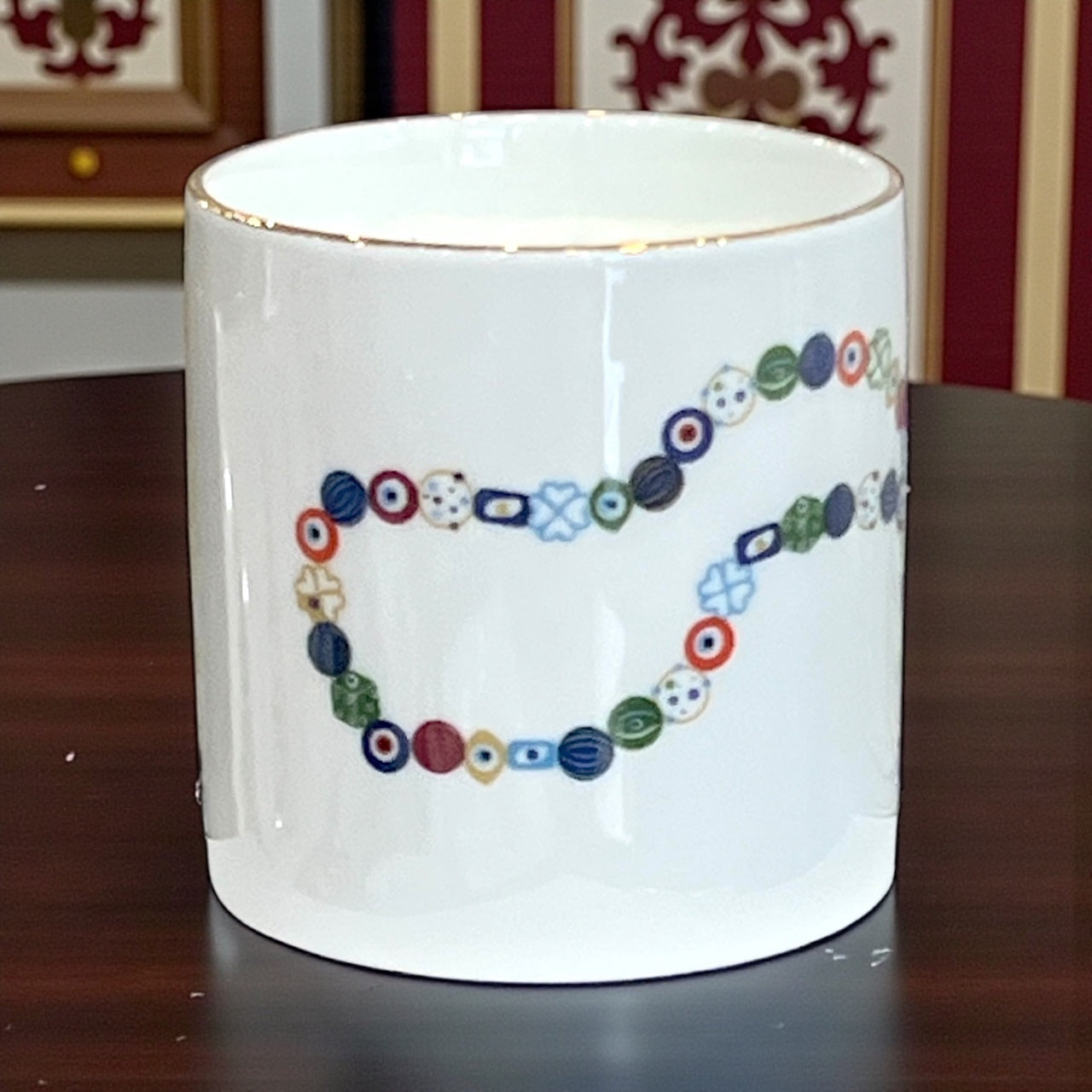 Εκλεπτυσμένα πορσελάνινα αντικείμενα, διακοσμημένα με πολύχρωμες λεπτομέρειες που θυμίζουν χειροποίητο κομπολόι. Η λευκή, γυαλιστερή πορσελάνη αναδεικνύεται από τις χρυσές λεπτομέρειες στο χείλος, ενώ το μοτίβο σε μπλε, πράσινες και γήινες αποχρώσεις προσθέτει μια διακριτική αύρα παράδοσης και καλού γούστου.